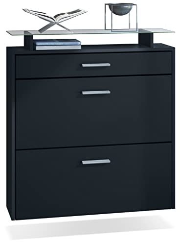Ajoutez une touche moderne et raffinée à votre intérieur avec le meuble chaussures Malea de Vladon. Ce meuble à chaussures murale est le choix parfait pour organiser jusqu’à 16 paires de chaussures et différents accessoires. Doté de 2 clapets, 1 tiroir et 1 tablette en verre, il est disponible en noir mat et noir mat. Son design élégant est complété par des poignées argent et des rails télescopiques en métal silencieux. Fabriqué en Allemagne avec des panneaux agglomérés de qualité, le meuble est robuste et offre une finition de qualité. La livraison comprend le meuble, la tablette en verre, le matériel de montage et une notice. Installez le meuble en un clin d’œil et profitez de son look moderne et de son entretien facile.