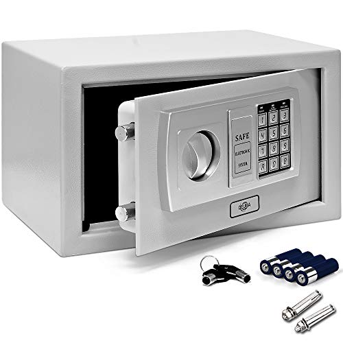 Fabriqué en acier solide, ce coffre-fort est conçu pour offrir une sécurité maximale. Il est équipé d’une serrure à combinaison électronique, qui peut être programmée rapidement et facilement avec un code à 3-8 chiffres que vous pouvez modifier à tout moment si nécessaire. En outre, le coffre-fort est équipé de 2 boulons de fixation qui peuvent être fixés au mur ou au sol pour une sécurité encore plus accrue.